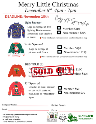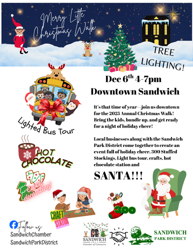 Have a wonderful time ushering in winter and the holiday season! This SACC event in collaboration with the Sandwich Park District is FREE to attend. Tree lighting kicks off the fun packed event at 4pm followed by Santa, Crafts for kiddos, Food Trucks, Cookie Decorating, and MUCH MORE this year!