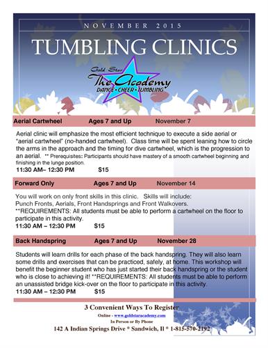 Students will learn drills for each phase of the back handspring. They will also learn some drills and exercises that can be practiced, safely, at home. This workshop will benefit the beginner student who has just started their back handspring or the student who is close to achieving it! **REQUIREMENTS: All students must be able to perform an unassisted bridge kick-over on the floor to participate in this activity.