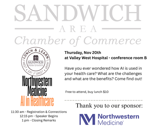 Northwestern Medicine is hosting this event at Valley West in community room B. The topic for their talk will be AI in Medical Care. Now is the time to learn all we can about AI and how it can positively impact our health and our future!